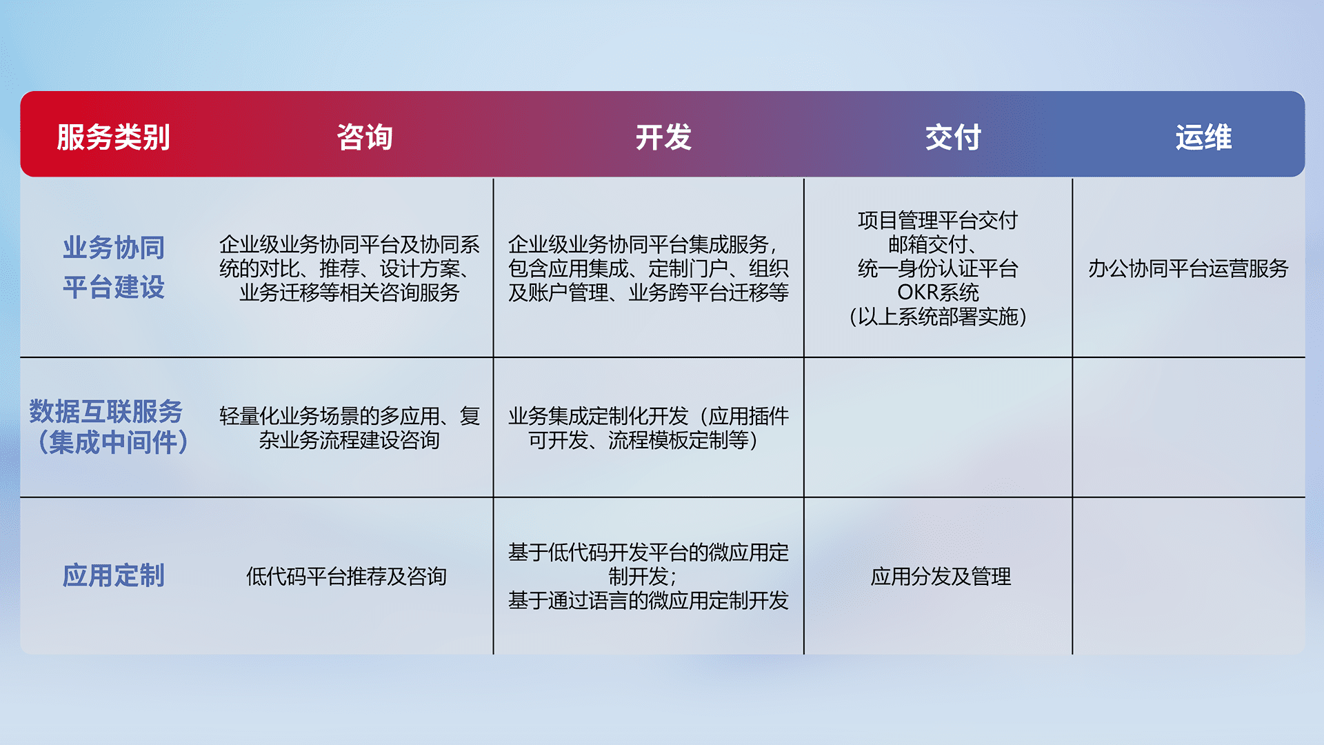 针对钉钉、、企微、、、IDaas等平台级产品提供产品的规划、、方案、、、、交付、、定制化开发等服务,,,实现如统一协同办公、、、、智能客户服务、、混合会议管理、、智能数据查询、、、等业务场景,,,实现数字化转型。。。。